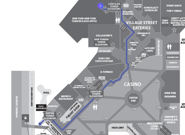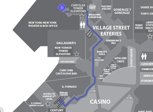 From Greenburg's Deli, make a left. Walk past Broadway Burger Bar to the NY-NY Theater Entrance.