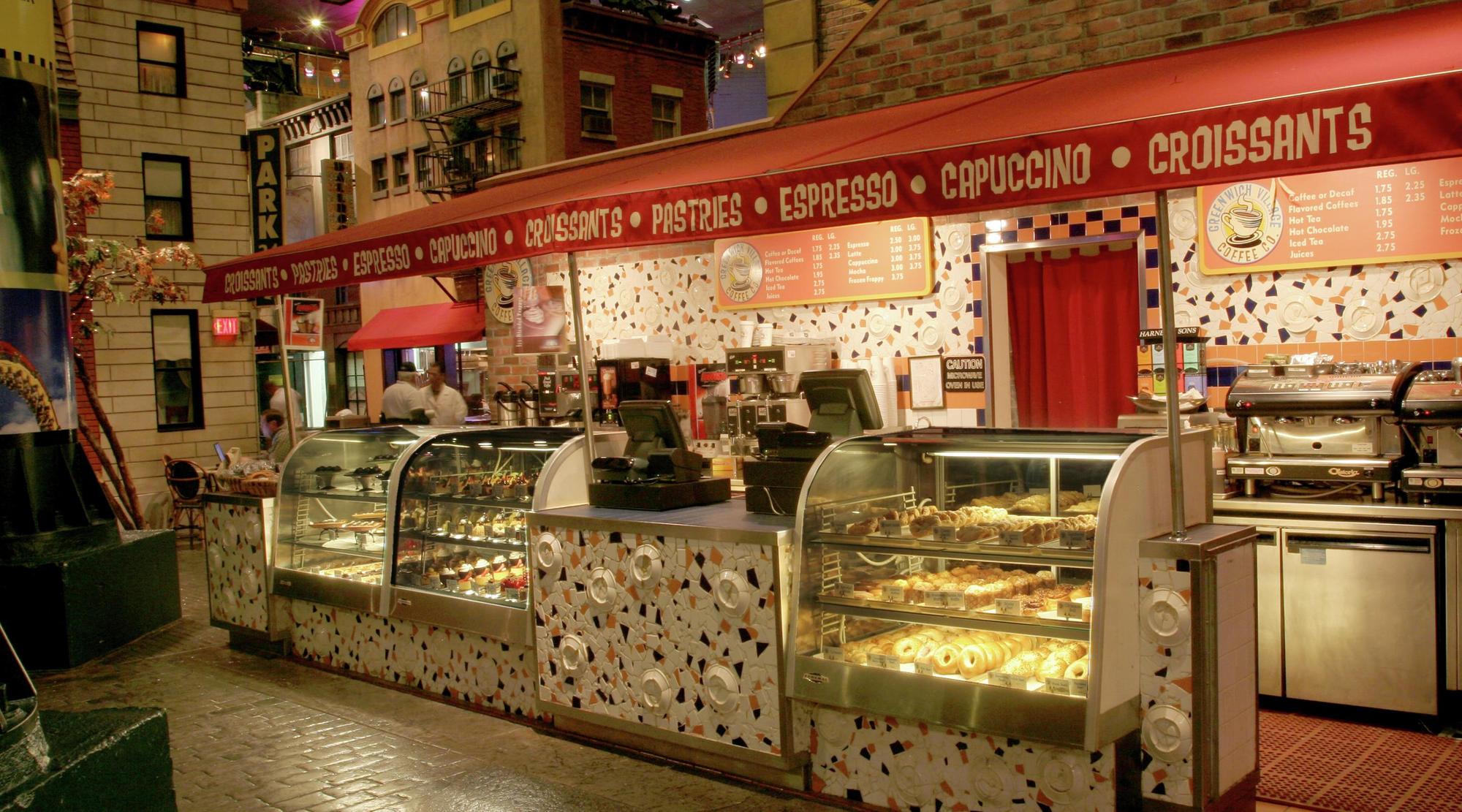 Stroll through the brownstone and tree-lined Greenwich Village and experience sidewalk dining and all its charm. The Village Eateries offer Sirrico’s New York pizza, famous neighborhood sandwiches at Greenberg's Deli, fish, chips, and more at Fulton’s Fish Frye, fresh baked pastries at the Village Bakery and the best hot dogs on the strip at Times Square to Go.